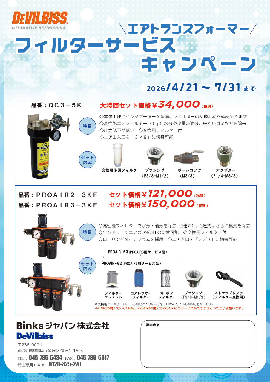 デビルビスエアトランスフォーマーフィルターサービスキャンペーンお知らせ 2026 4/24 2026/04/24 フィルターサービスキャンペーン 2026/4/21~7/31まで 本体にフィルター等のサービス品が付いています。 工具 新着情報 シンナー類の販売について